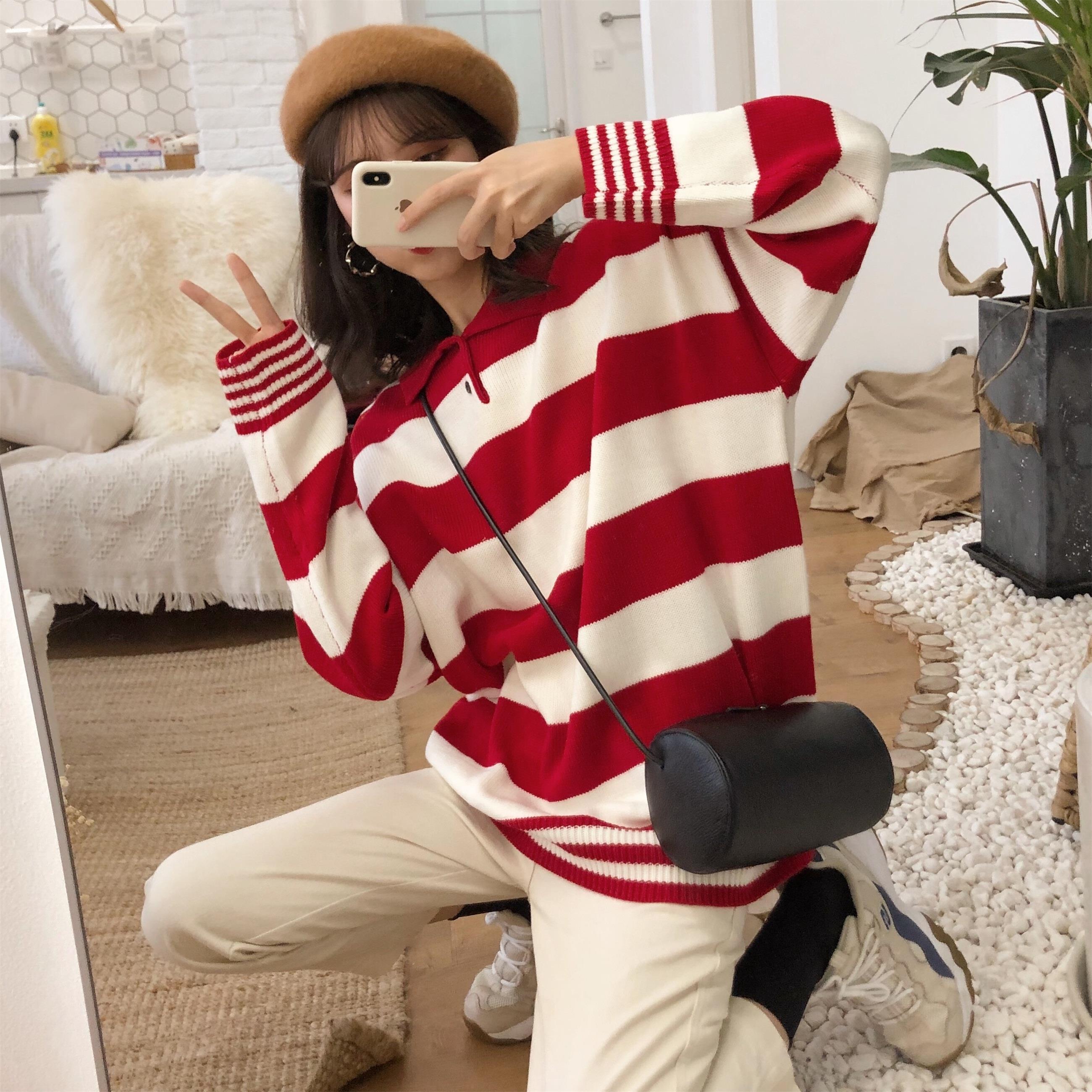 / 韓版POLO領新款上衣修身顯瘦條紋寬松慵懶風長袖中長款套頭毛衣女
