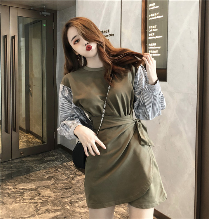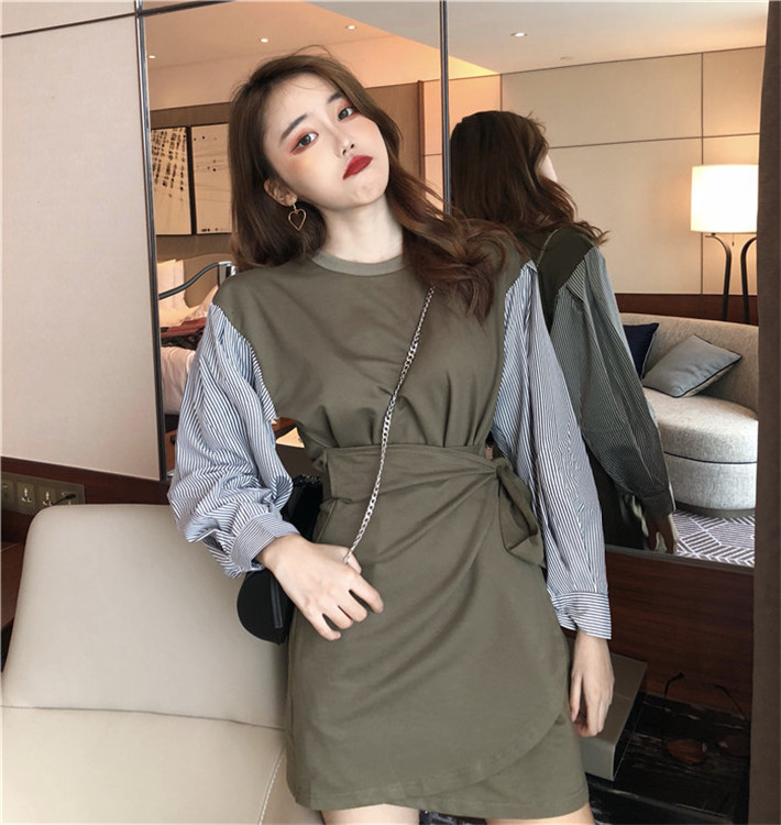 晚晚風新款時尚韓版chic圓領衛衣拼接條紋長袖不規則收腰連衣裙女
