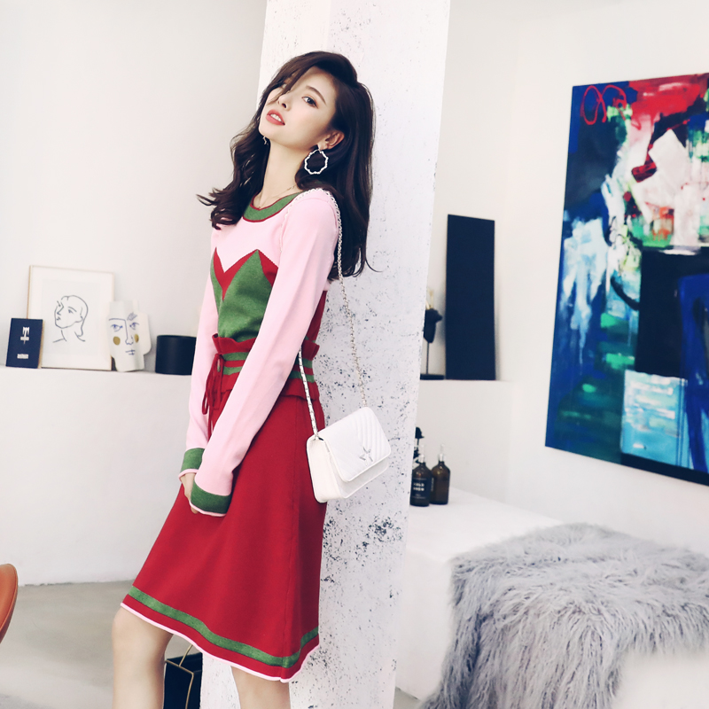 / 2018秋冬新款圓領時尚毛衣女針織衫拼色套頭修身韓版連衣裙中裙