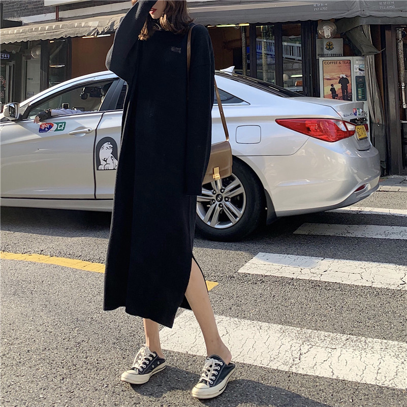 / 2018秋冬新款高領百搭長款純色修身開叉毛衣裙時尚復古chic連衣裙
