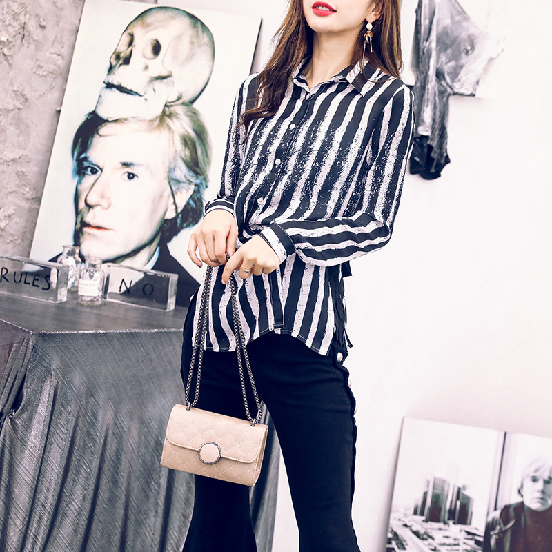 / 名媛氣質2018秋裝新款設計感綁帶條紋襯衫高腰顯瘦喇叭長褲套裝