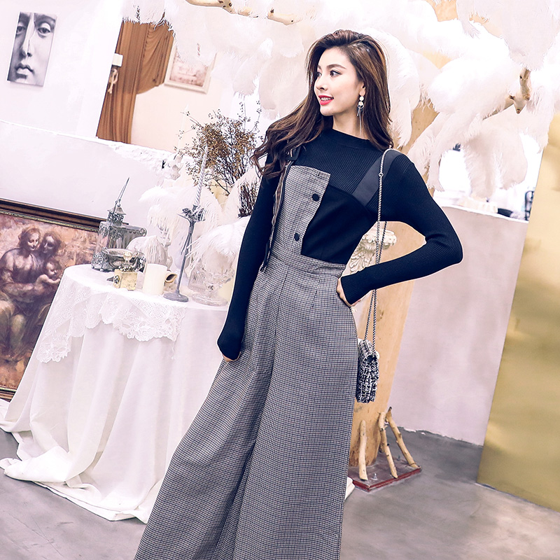 2018初秋新款毛衣兩件套港味早秋時尚高腰拼接格子背帶褲套裝女潮