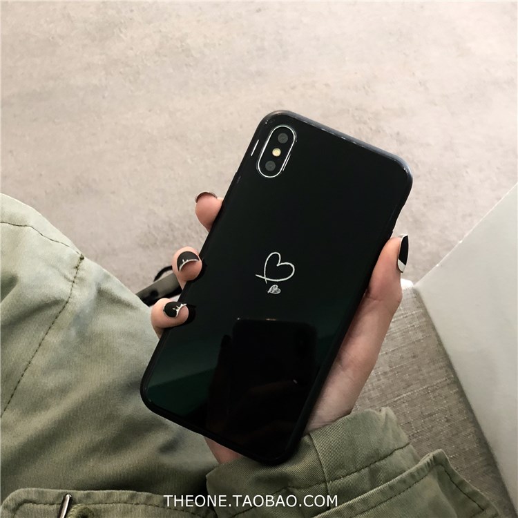 簡約黑色玻璃愛心蘋果X手機殼iphone7plus/8/6S情侶全包軟殼女款