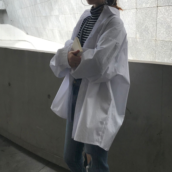 chic港味中長款簡約百搭翻領寬松燈籠袖白襯衫女長袖秋季女上衣