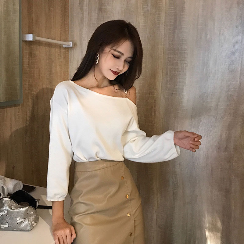 / 2018秋裝韓版時尚斜肩上衣女純色針織衫百搭chic氣質顯瘦寬松T恤