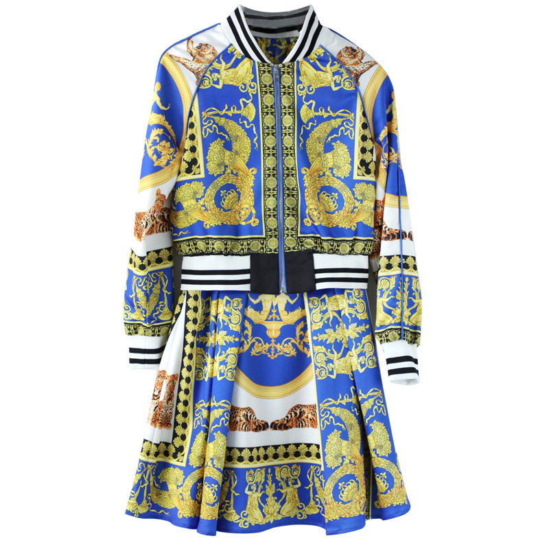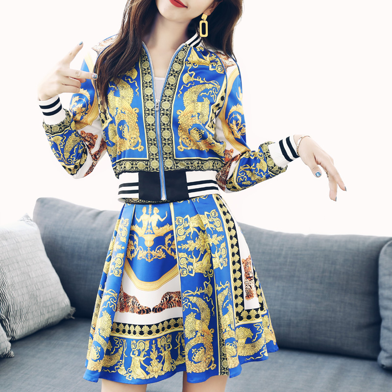 名媛時尚套裝裙秋裝女2018新款印花夾克時髦兩件套半身百褶裙子潮