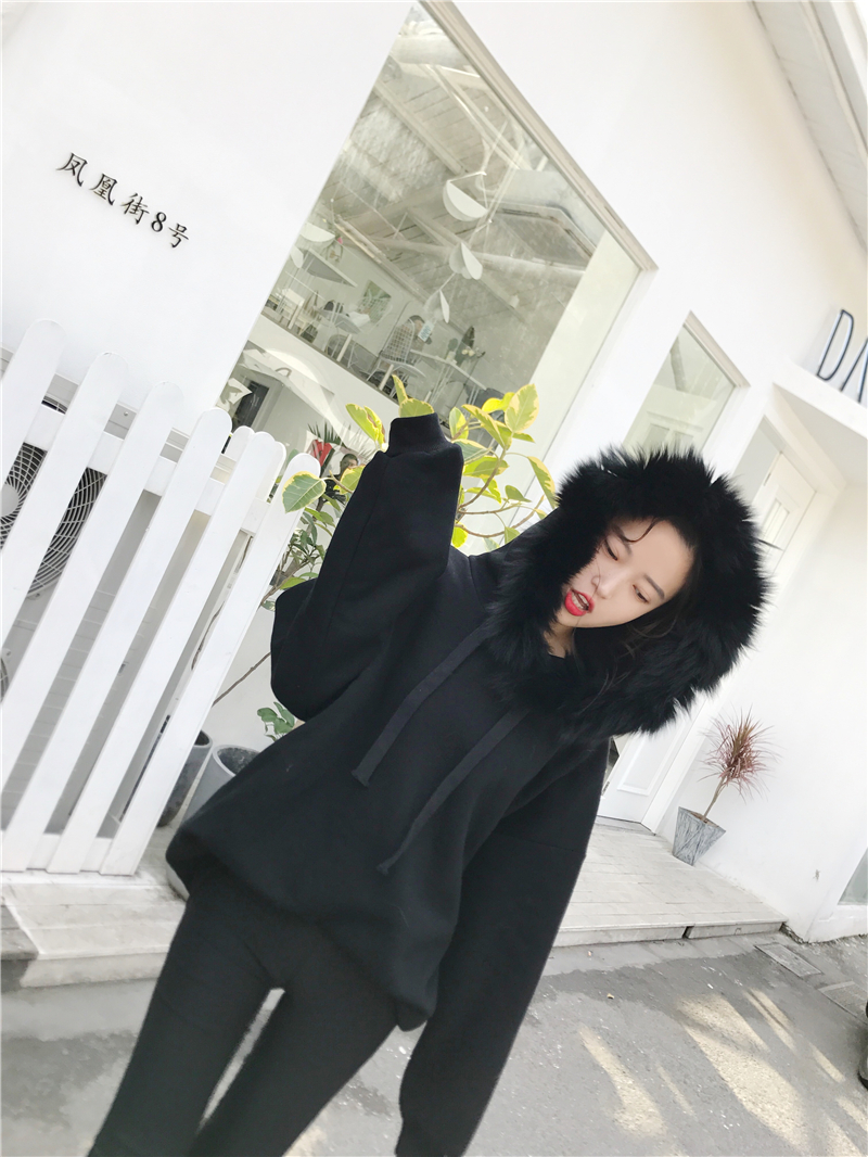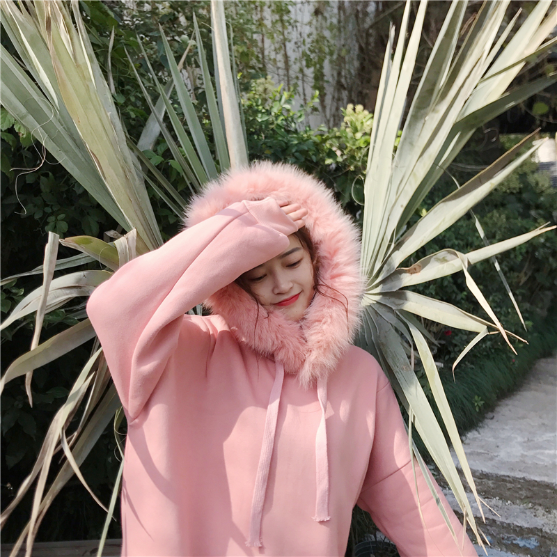 2018秋冬新款韓版純色寬松上衣女chic毛毛領加絨加厚百搭連帽衛衣