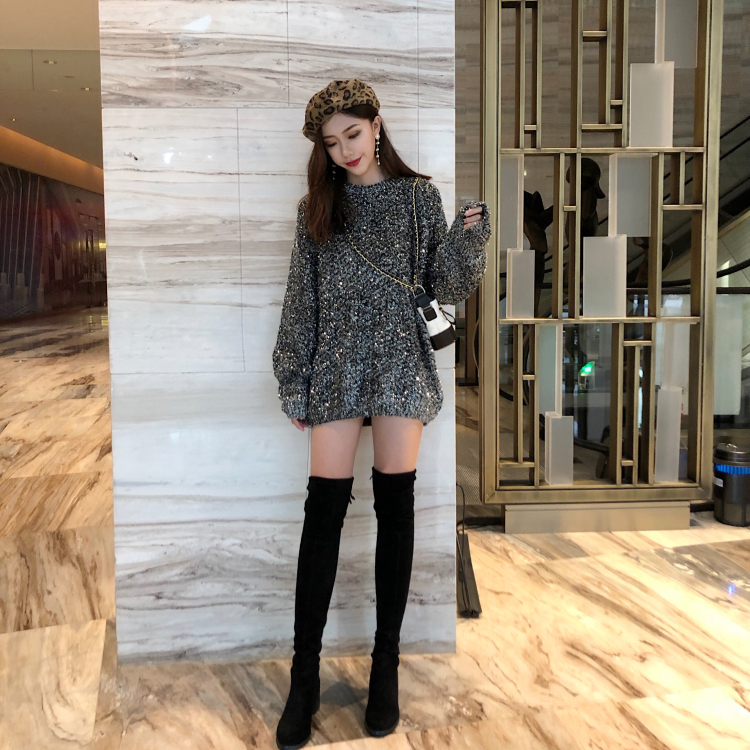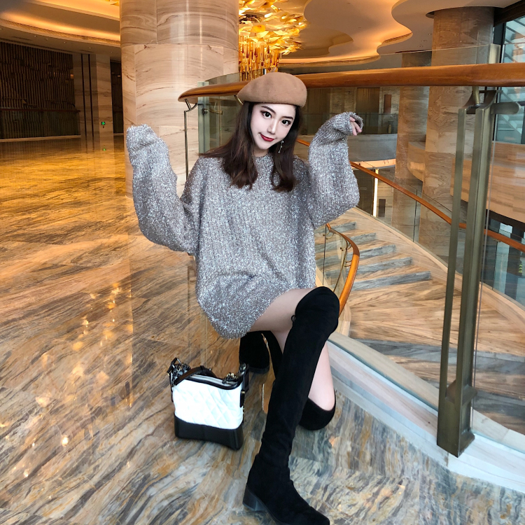 新款復古閃閃毛衣針織衫寬松慵懶風圓領長袖百搭chic風顯瘦上衣女