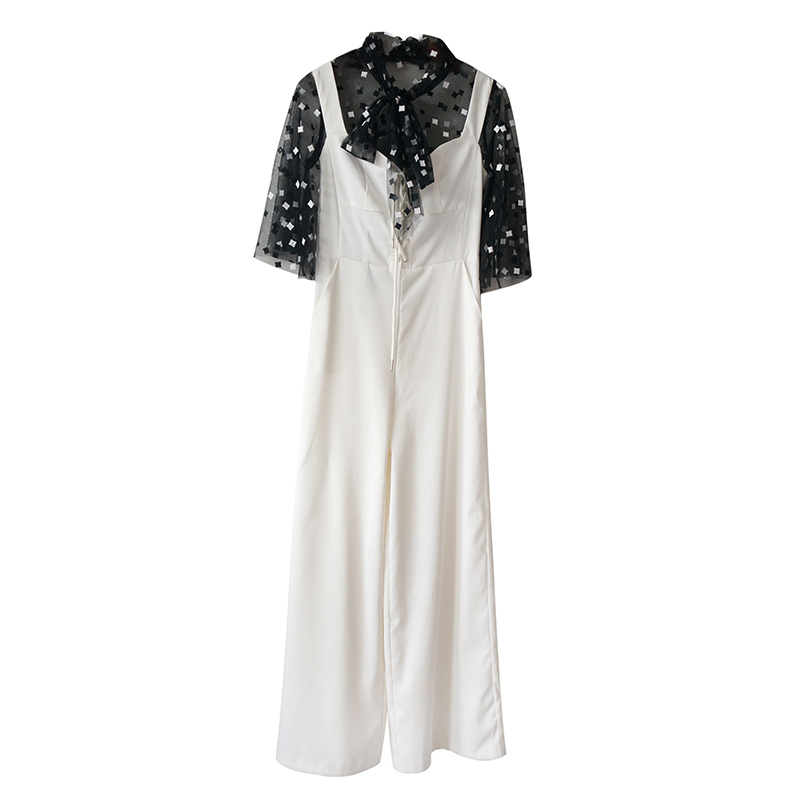 / 俏皮套裝女兩件夏韓版氣質網紗中袖上衣打底衫白色高腰背帶連體褲