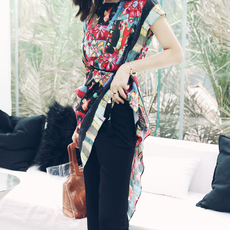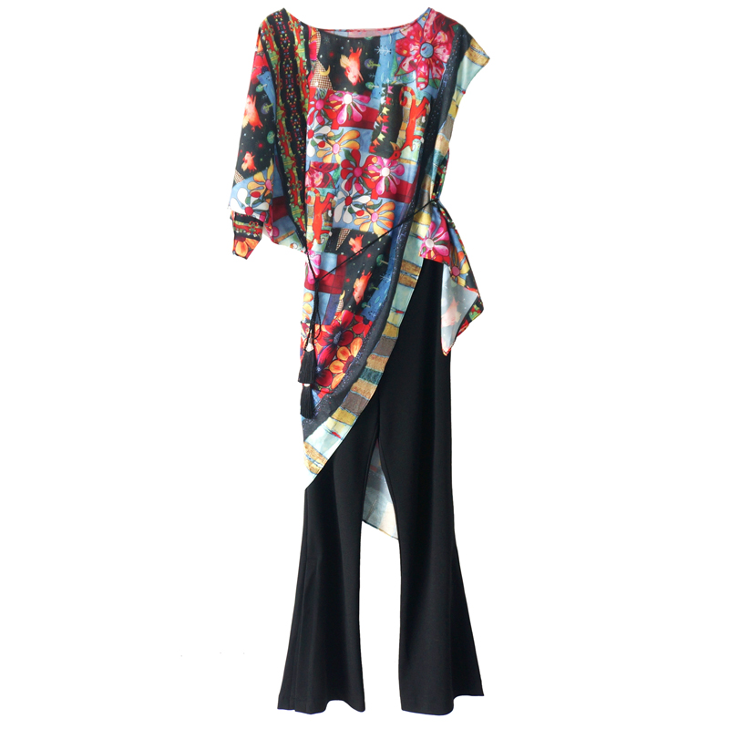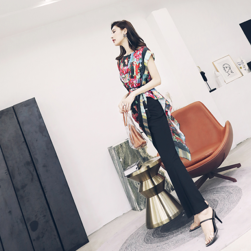 S秀淑女氣質2018夏季新款不規則中長款上衣開叉微喇長褲顯高套裝