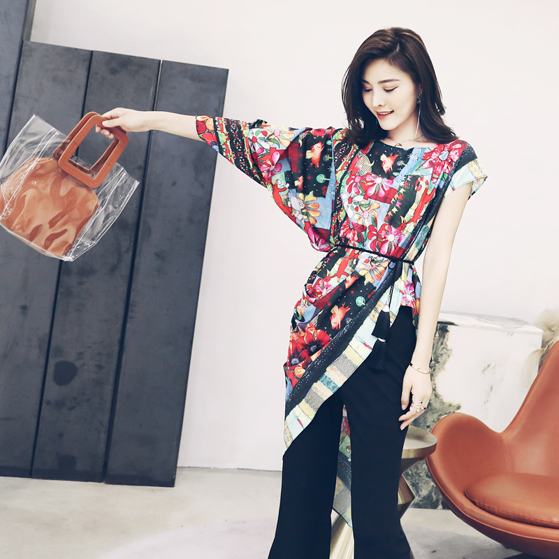 / S秀淑女氣質2018夏季新款不規則中長款上衣開叉微喇長褲顯高套裝