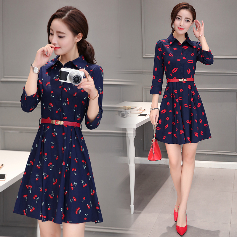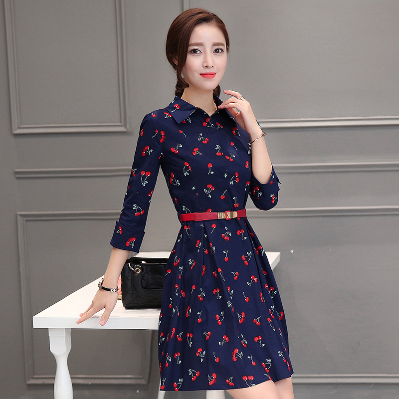 夏季新款潮女裝韓版修身顯瘦中長款七分袖時尚收腰襯衫連衣裙