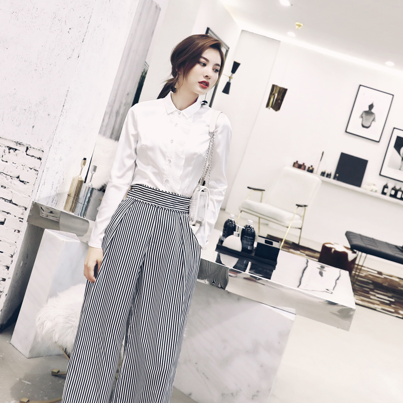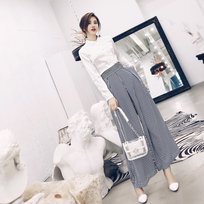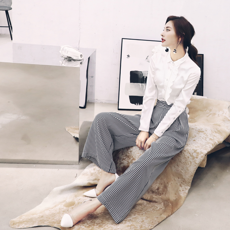 / 名媛氣質2018秋季套裝白色襯衫高腰修身條紋闊腿褲時尚兩件套女潮