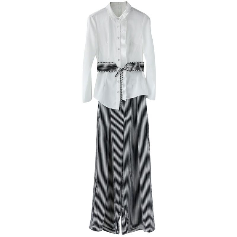 名媛氣質2018秋季套裝白色襯衫高腰修身條紋闊腿褲時尚兩件套女潮