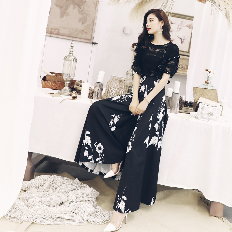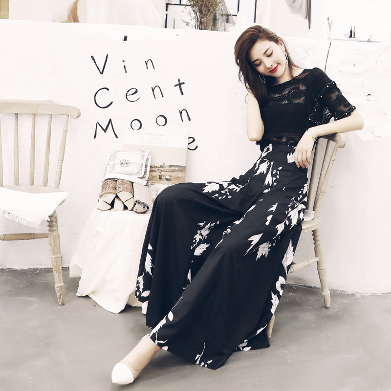 名媛氣質印花褲子2018新款鏤空上衣垂感高腰長褲闊腿褲夏兩件套裝