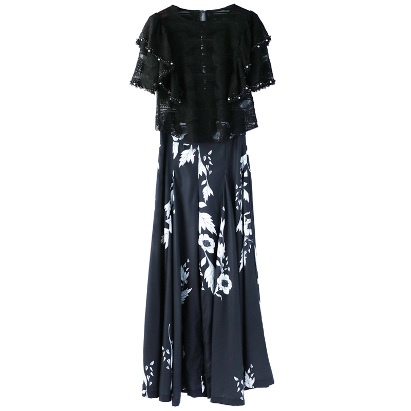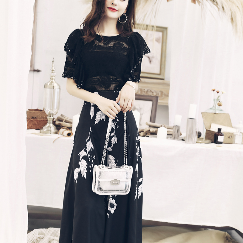 / 名媛氣質印花褲子2018新款鏤空上衣垂感高腰長褲闊腿褲夏兩件套裝