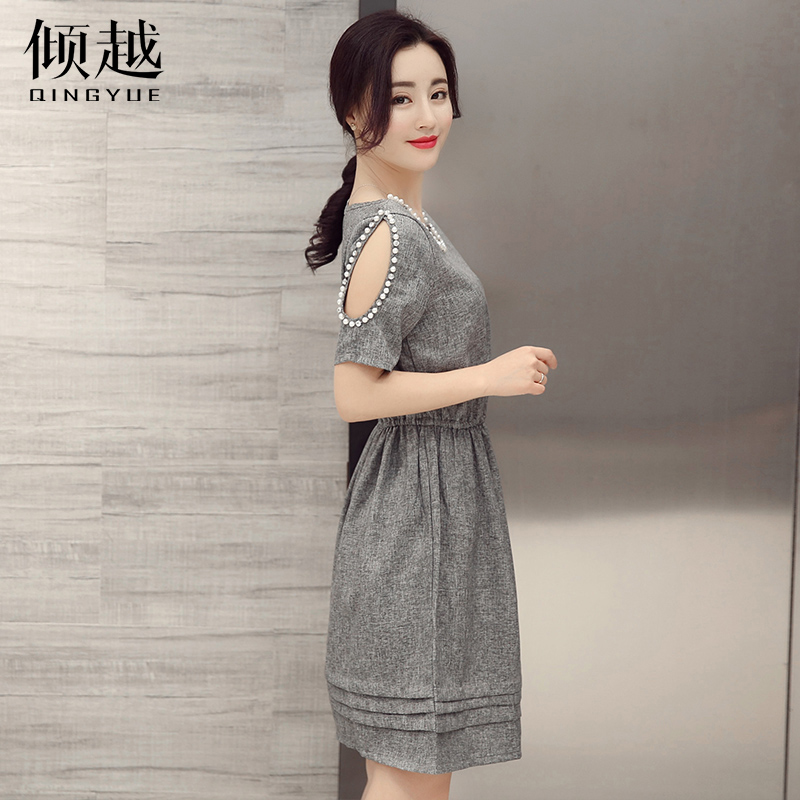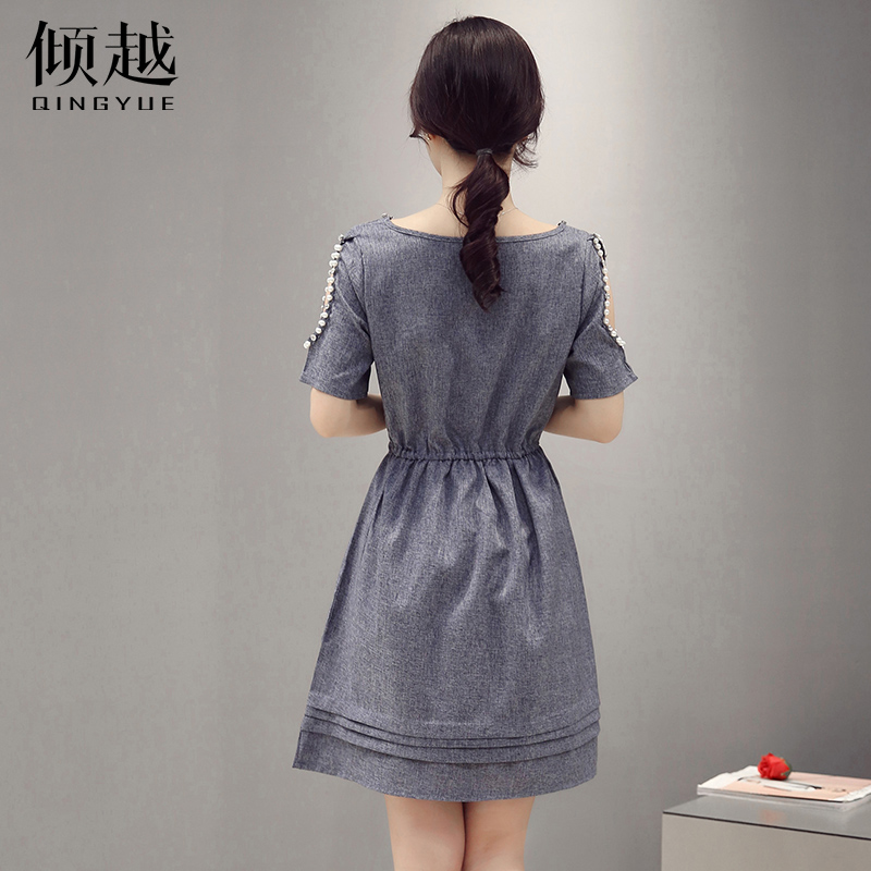 傾越2017夏季女裝收腰圓領短袖露肩連衣裙修身顯瘦簡約甜美裙子潮
