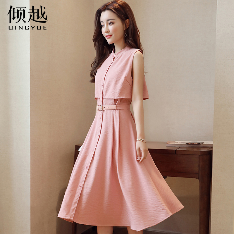 傾越2017夏季新款女裝假兩件襯衫裙中長款無袖連衣裙學院風A字裙