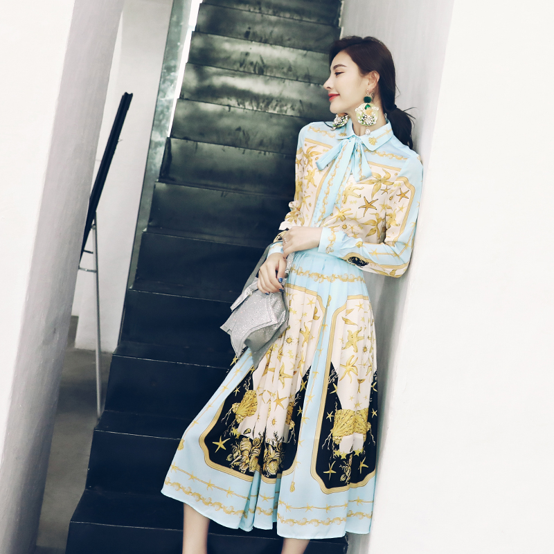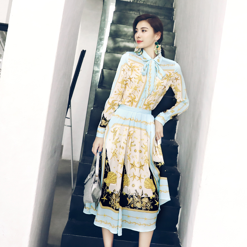 / 名媛氣質套裝裙秋季2018新款襯衫上衣印花半身百褶裙兩件套連衣裙