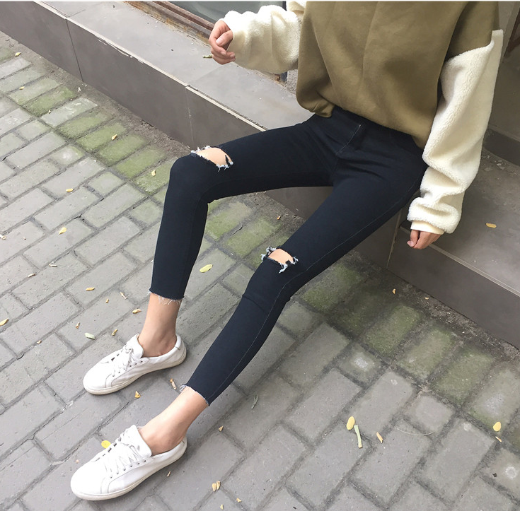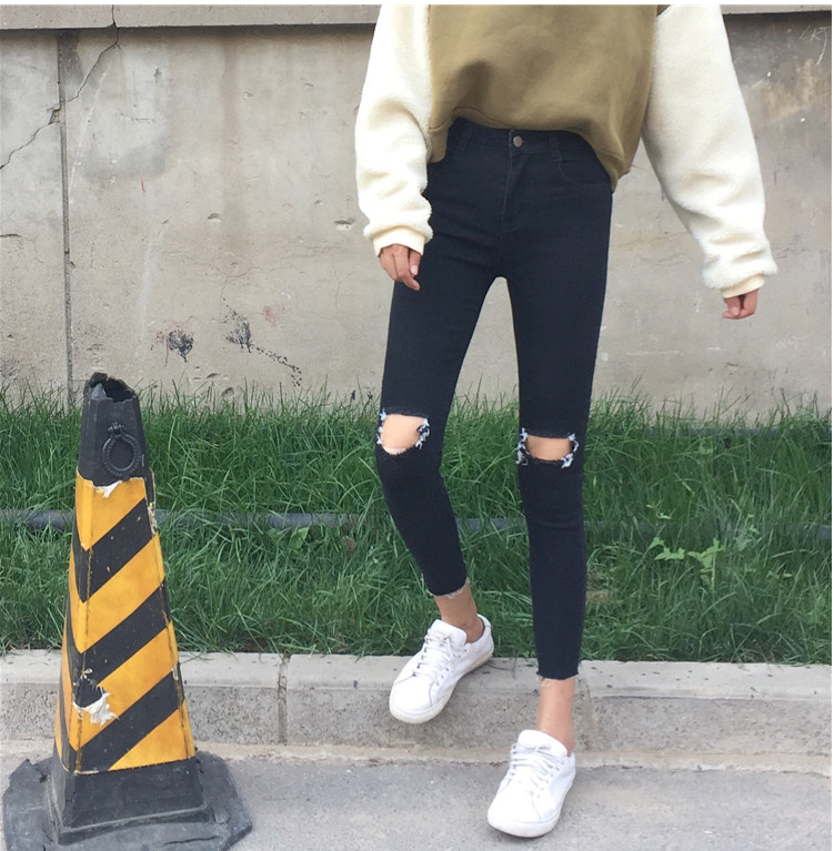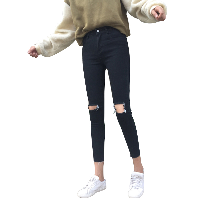 / 秋裝女裝韓版百搭高腰顯瘦彈力破洞牛仔褲緊身小腳褲九分褲鉛筆褲
