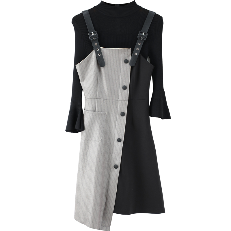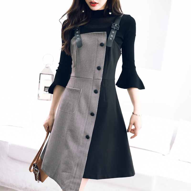 2018秋長袖針織上衣打底衫連衣裙時尚名媛拼接背帶裙兩件套裝裙子