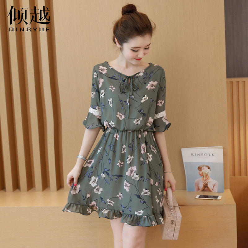 / 傾越2017春夏新款韓版女裝雪紡連衣裙顯瘦中長款魚尾裙子碎花長裙
