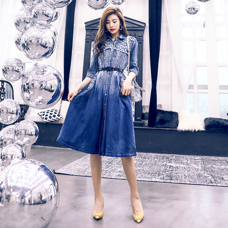 釘珠連衣裙女秋裝秋季2018新款韓版氣質修身收腰顯瘦中袖牛仔長裙