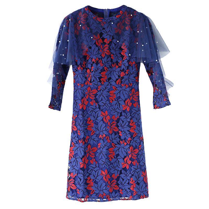 / S秀女裝印花蕾絲連衣裙女2018夏季新款拼接顯瘦圓領七分袖中裙