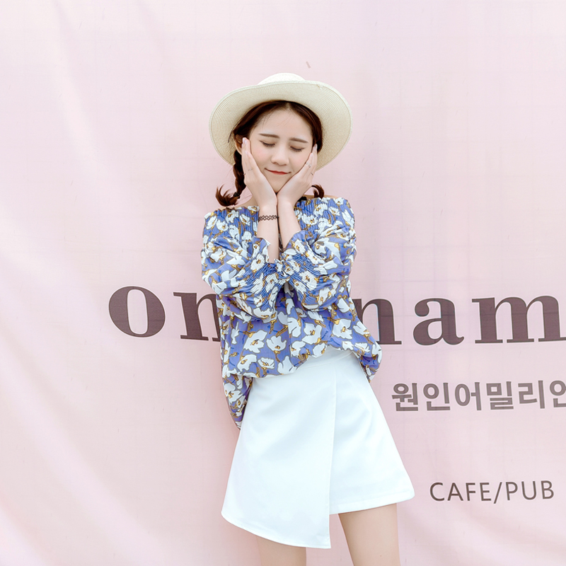 / 韓版夏裝新款甜美露肩一字領露肩碎花雪紡衫寬松小清新上衣潮