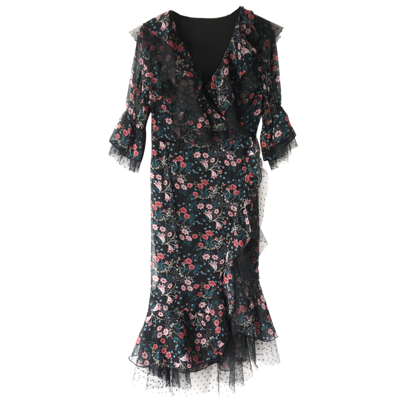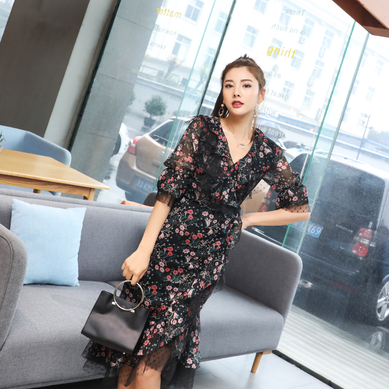 / 秋冬裝新款中長款時尚寬松氣質五分袖碎花網紗流蘇連衣裙潮女裝