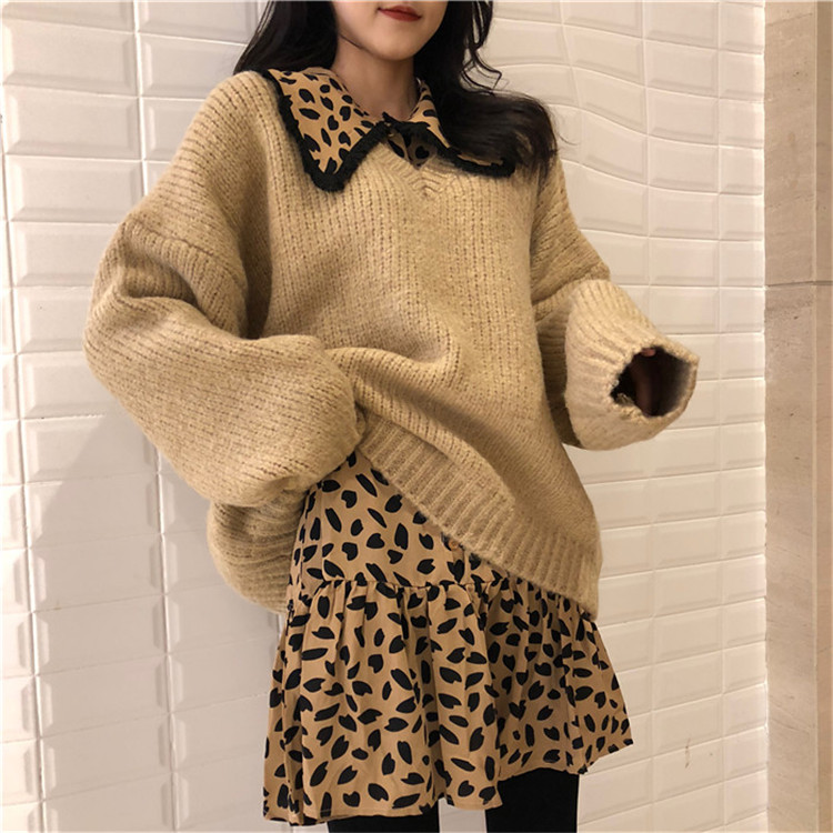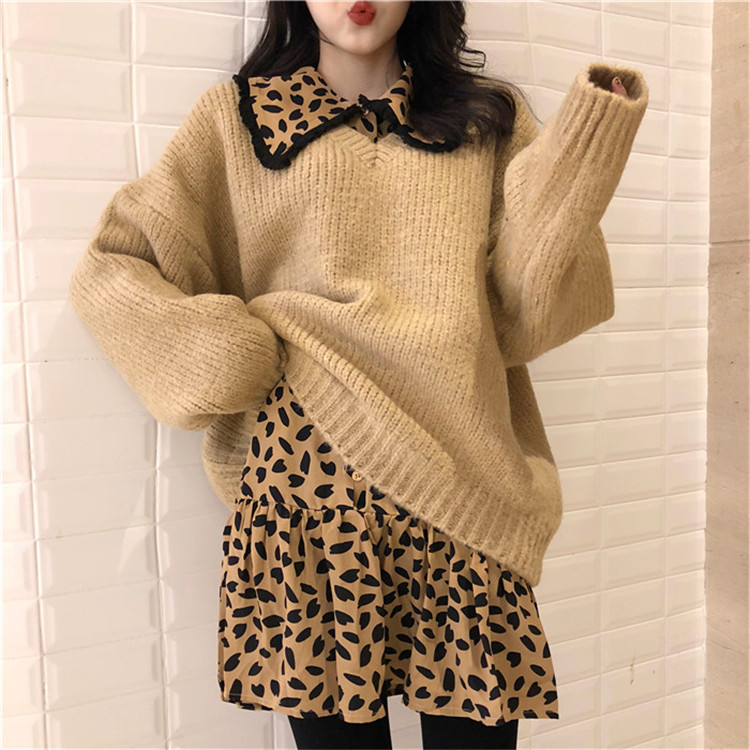 / 新款韓版復古流蘇娃娃領豹紋收腰連衣裙圓領套頭毛衣女時尚套裝潮