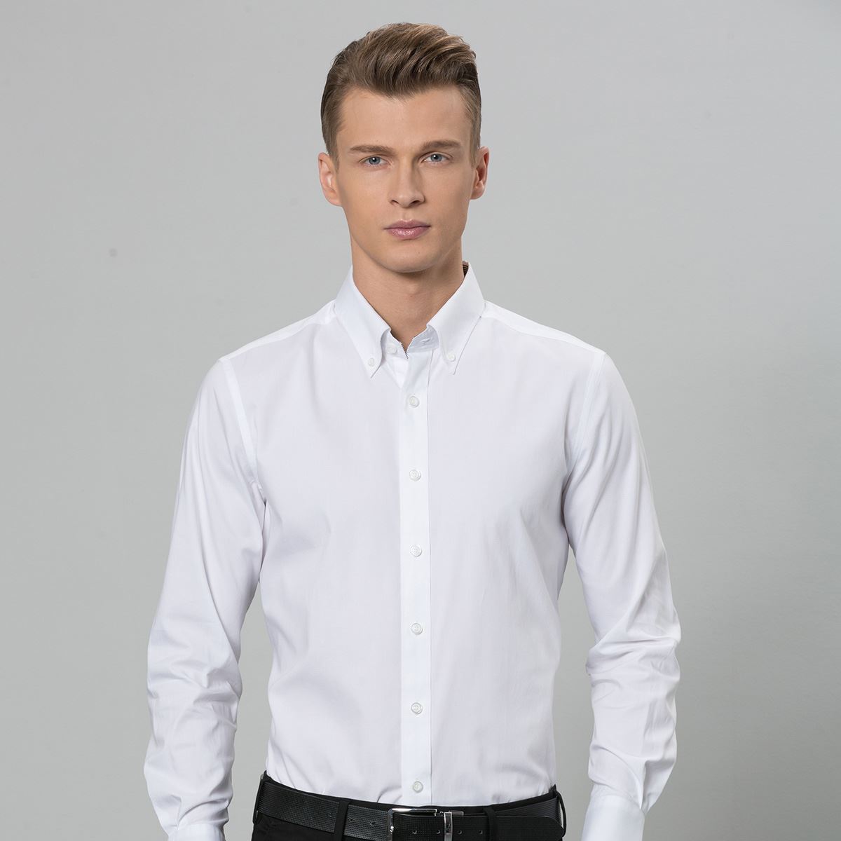 秋季精紡牛津紡男士長袖白襯衫釘扣領韓版修身型貼身純棉男裝襯衣