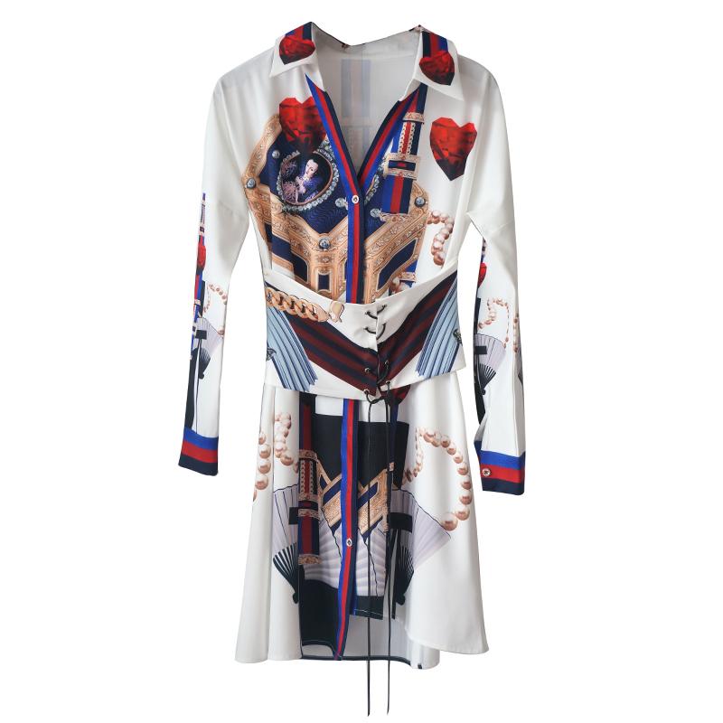 / 歐美名媛氣質2018新款秋高端女裝時尚復古腰封印花長袖襯衫連衣裙
