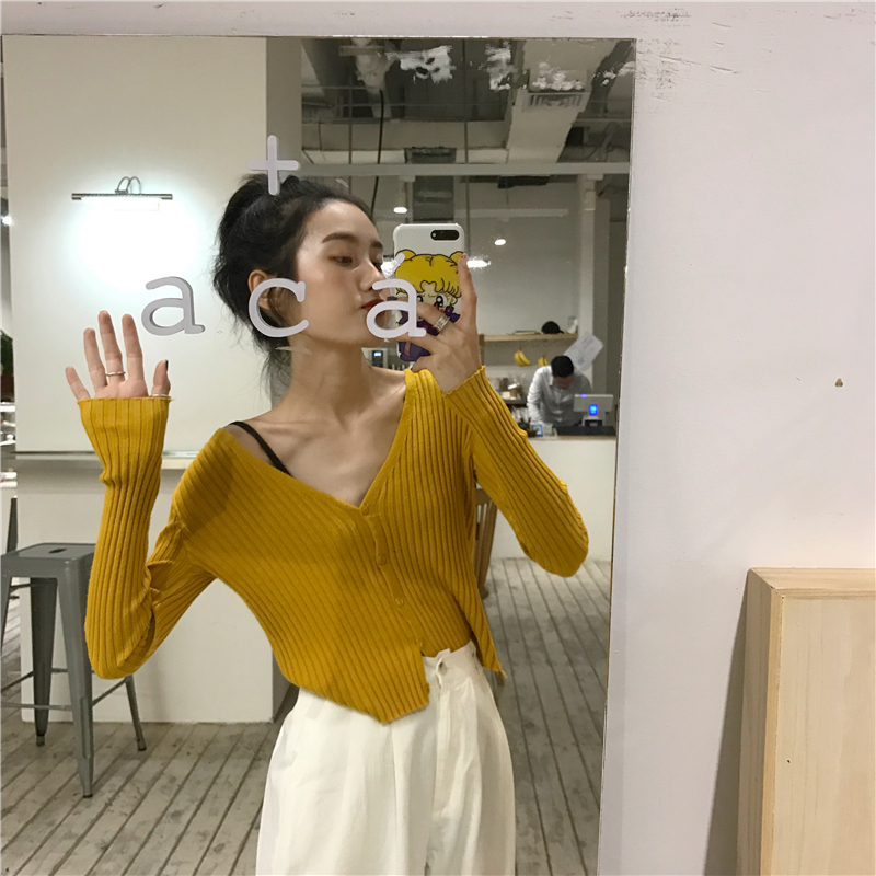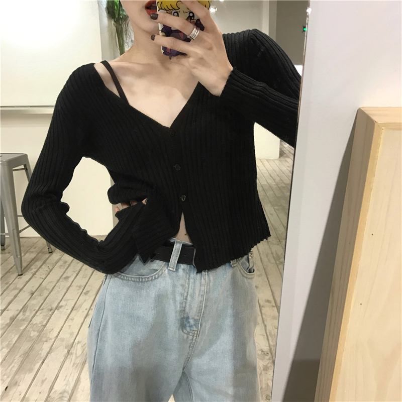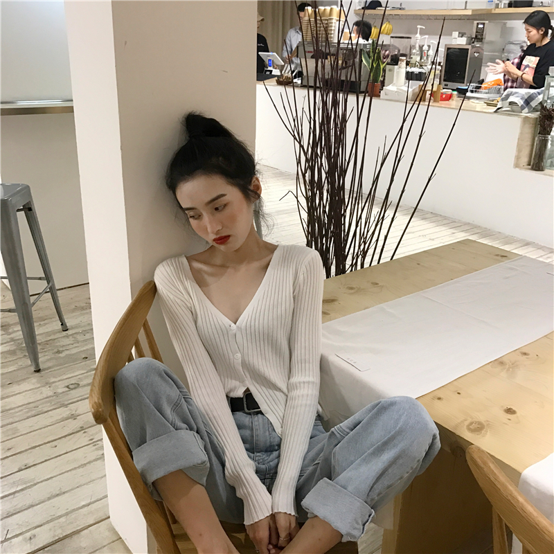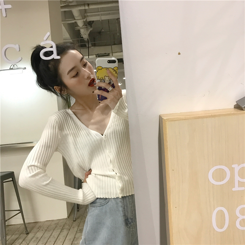 2018秋裝新款韓版百搭純色復古chic慵懶V領針織長袖短款毛衣開衫