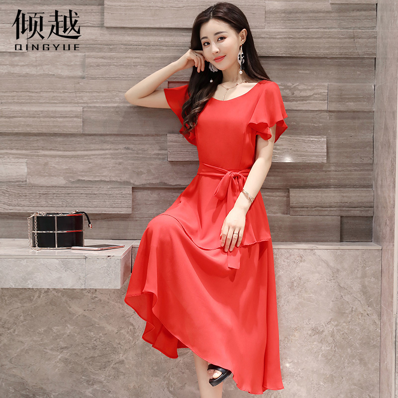夏季新款女裝2017韓版顯瘦高腰大碼氣質修身雪紡連衣裙過膝長裙女