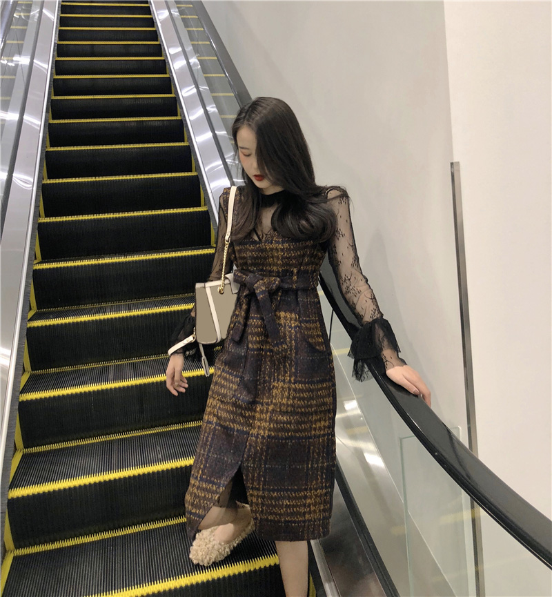 氣質復古格子毛呢長款連衣裙時尚套裝喇叭袖網紗打底上衣兩件套女
