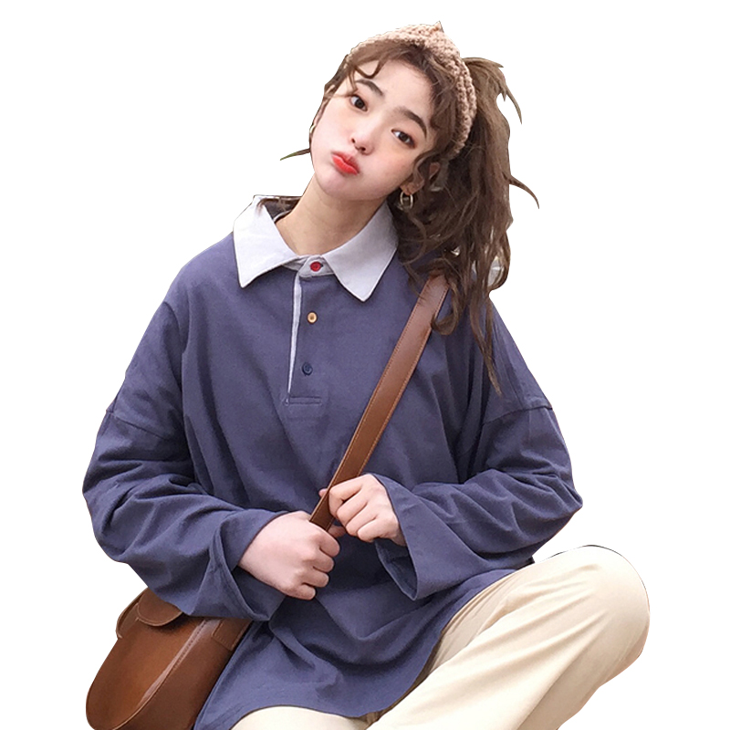/ 秋裝女裝韓版寬松個性撞色翻領長袖Polo領上衣學生休閑打底衫T恤