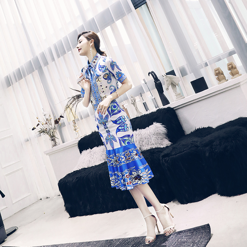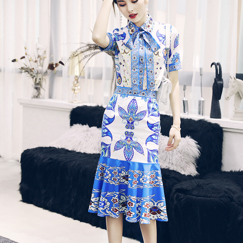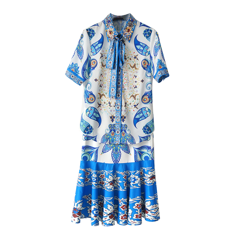 / 歐洲站印花套裝顯瘦兩件套2018夏裝新款短袖襯衫半身裙兩件套