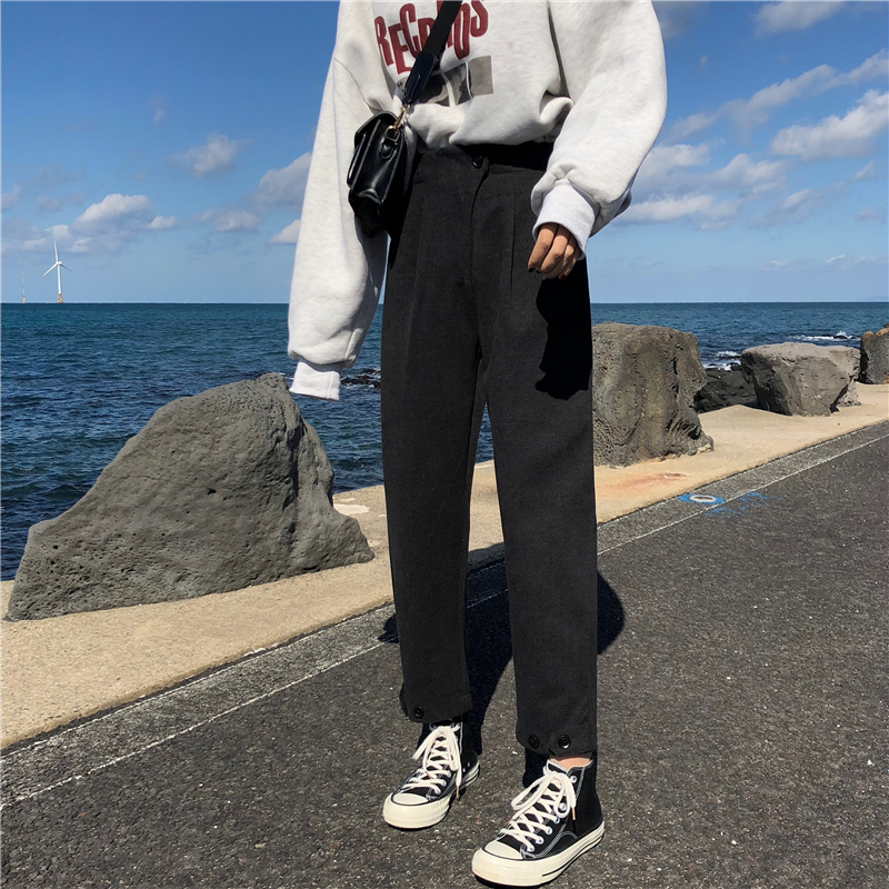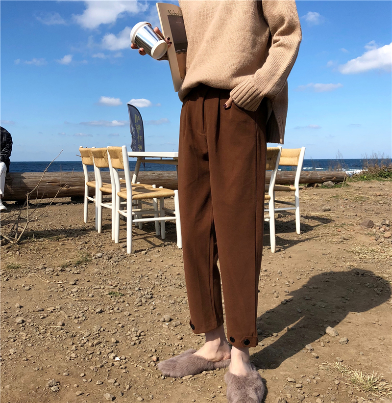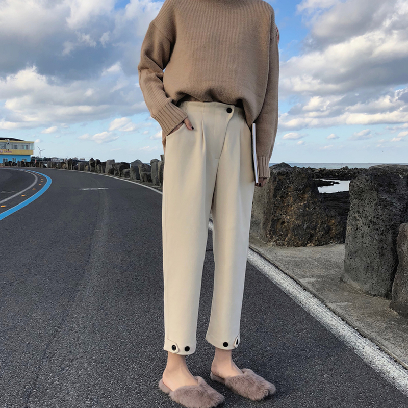 / 褲子女新款韓版百搭時尚松緊腰褲腳紐扣抽褶毛呢九分休閑直筒褲潮