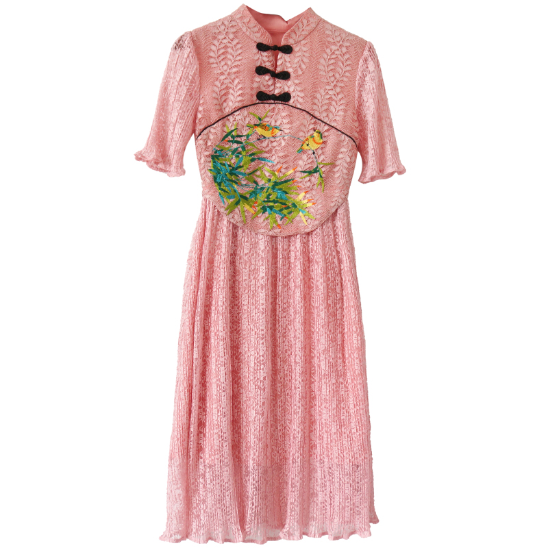 復古旗袍日常改良版淑女氣質刺繡連衣裙高腰蕾絲拼接短袖中長裙子