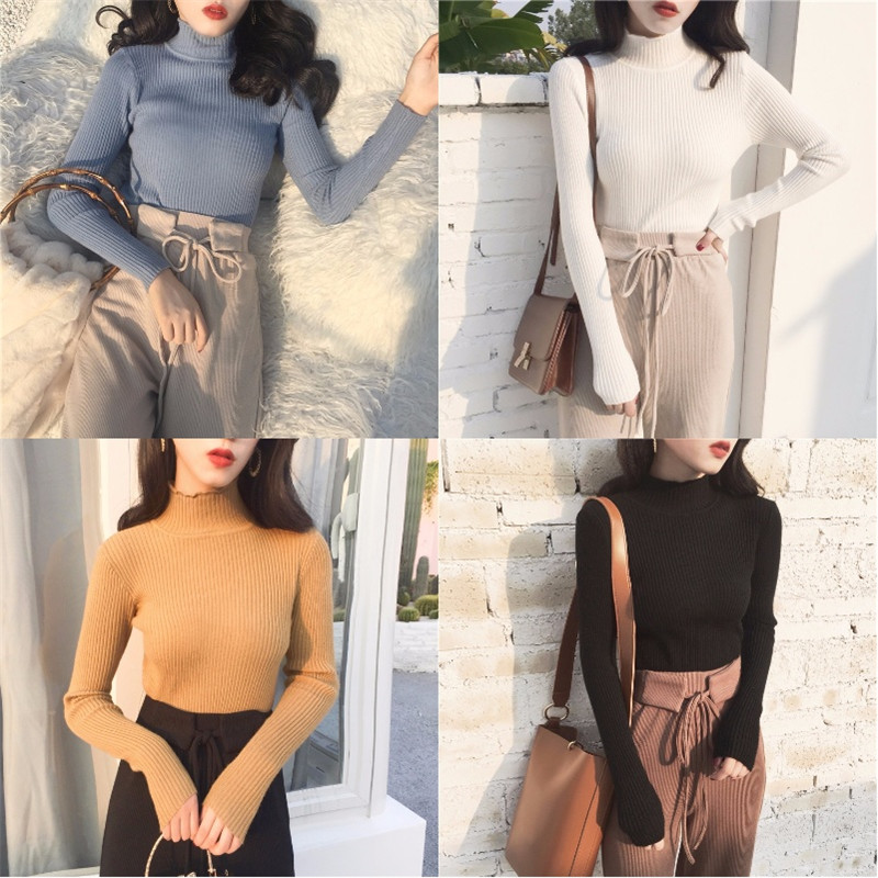 / 港味復古風修身顯瘦百搭半高領純色長袖針織打底衫chic早秋上衣女