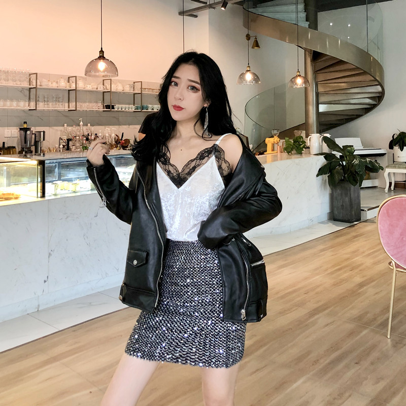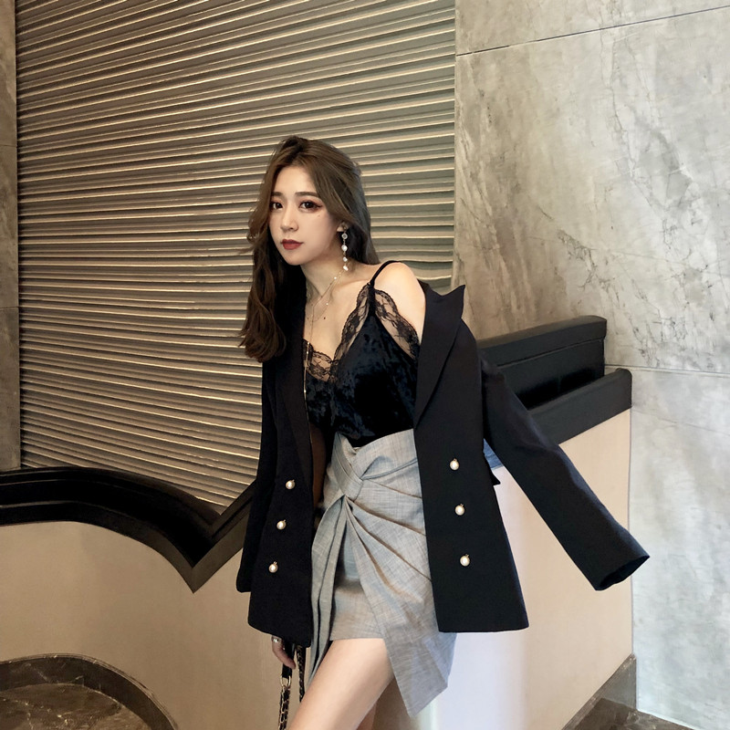 時尚套裝新款小心機吊帶背心V領性感露肩蕾絲上衣西裝外套兩件套