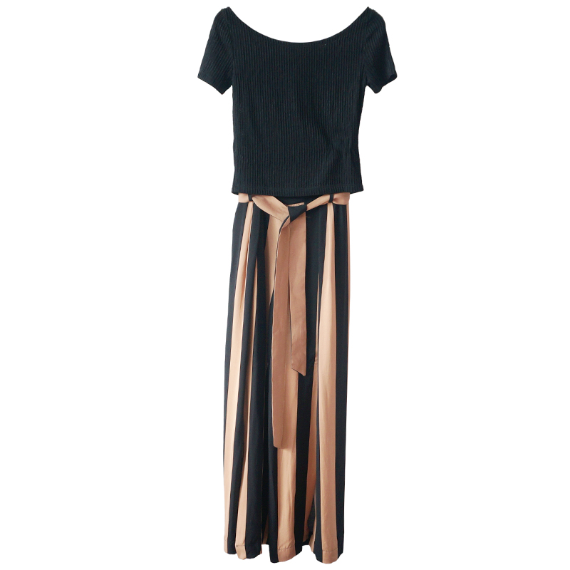 / 時尚闊腿褲套裝女夏2018新款短袖T恤條紋綁定高腰開叉長褲兩件套