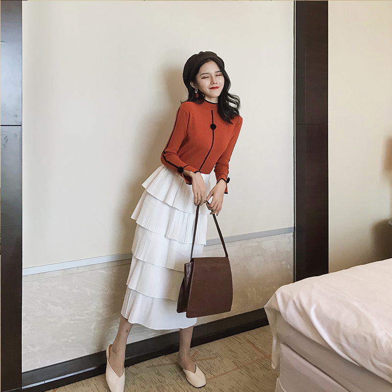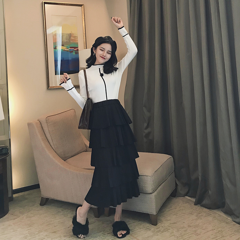 2018秋裝新款韓版晚晚風時尚套裝長袖打底衫上衣高腰蛋糕裙兩件套