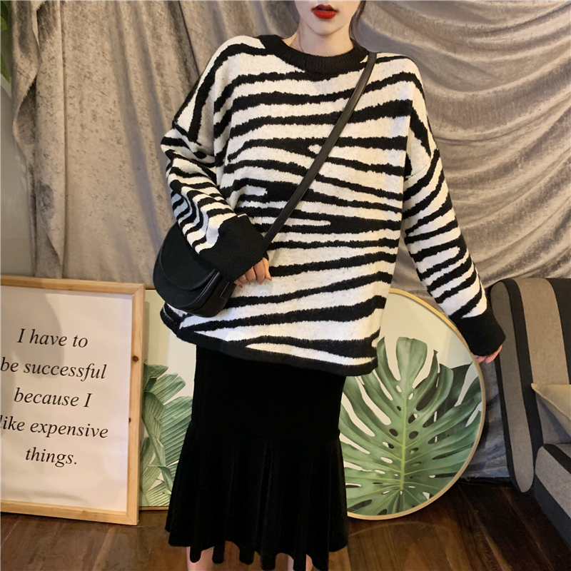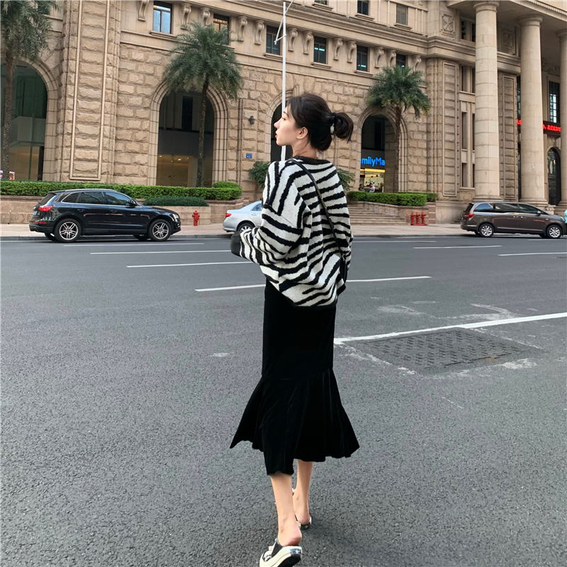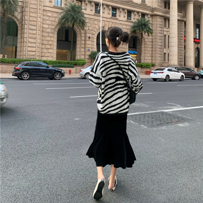 / 秋冬新款兩件套黑白斑馬紋圓領套頭毛衣高腰顯瘦魚尾裙時尚套裝女