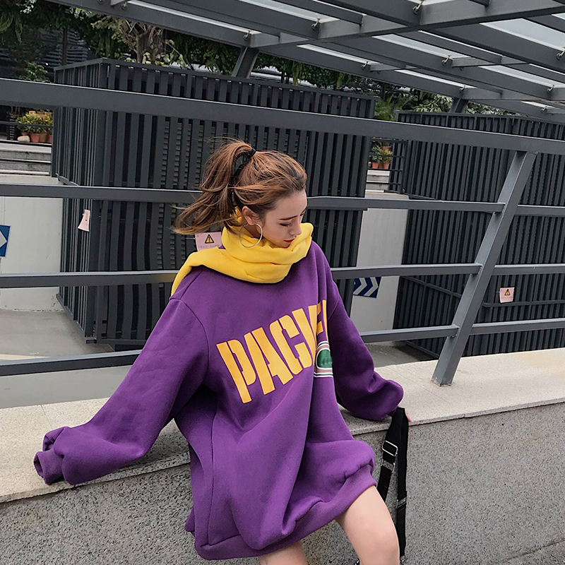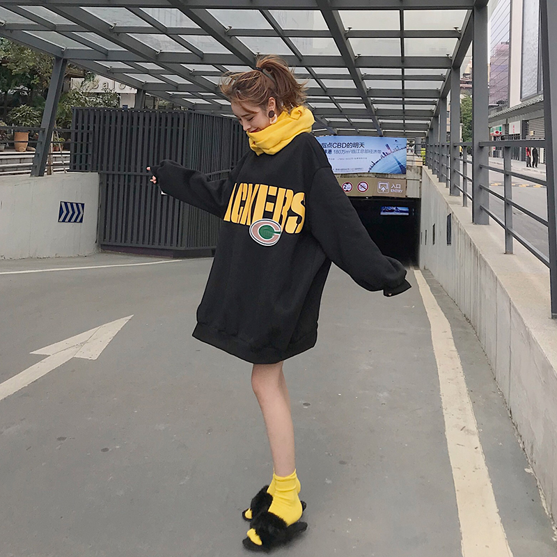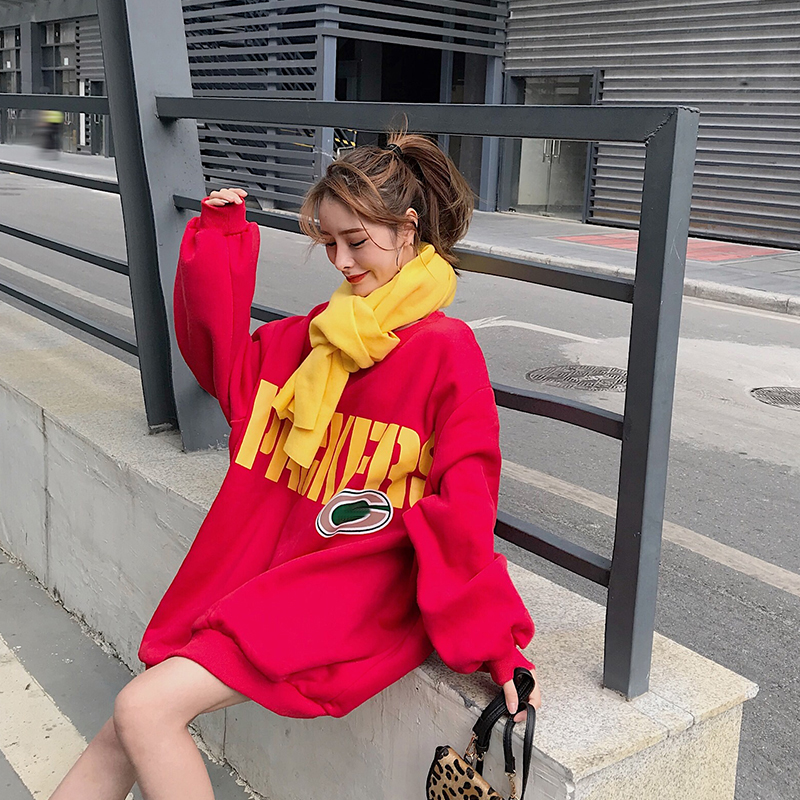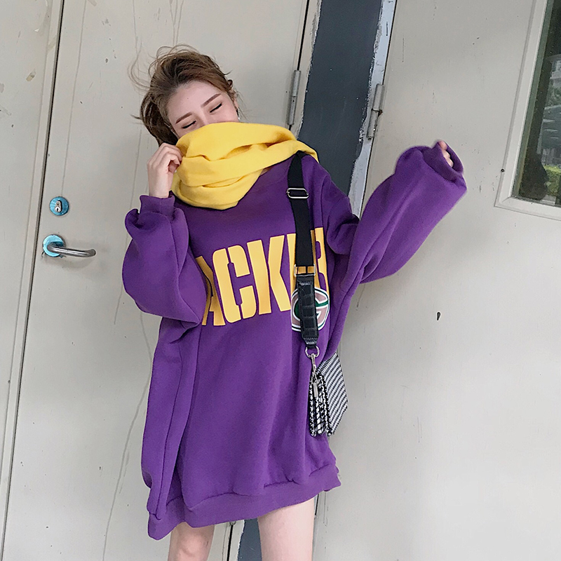 2018秋冬新款韓版小清新中長款加厚保暖上衣時尚chic衛衣潮送圍巾