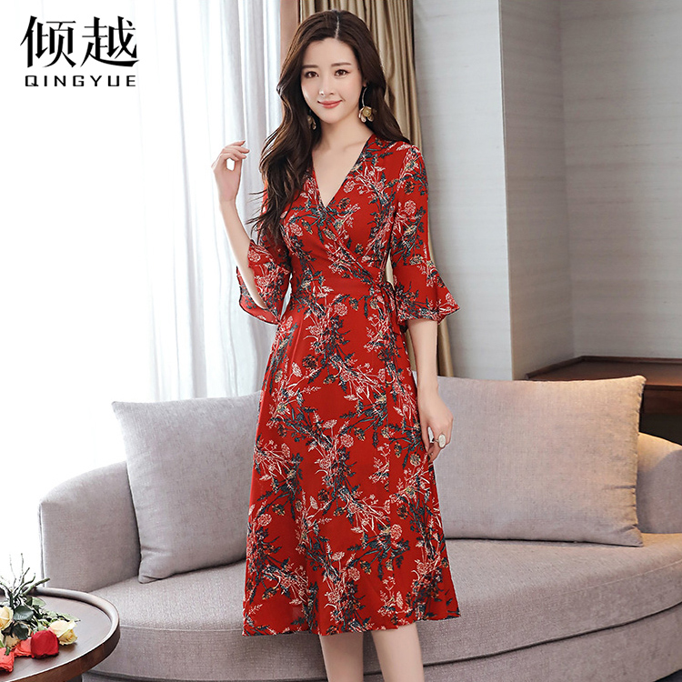 / 傾越春款連衣裙2017新款女夏季韓版七分袖V領中長雪紡印花A型裙子