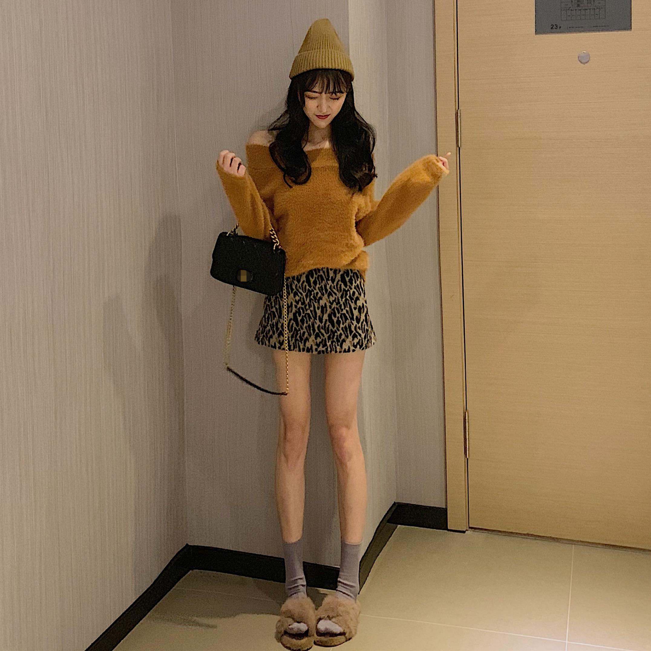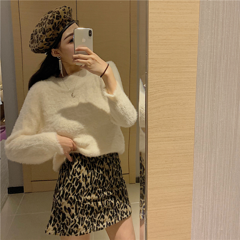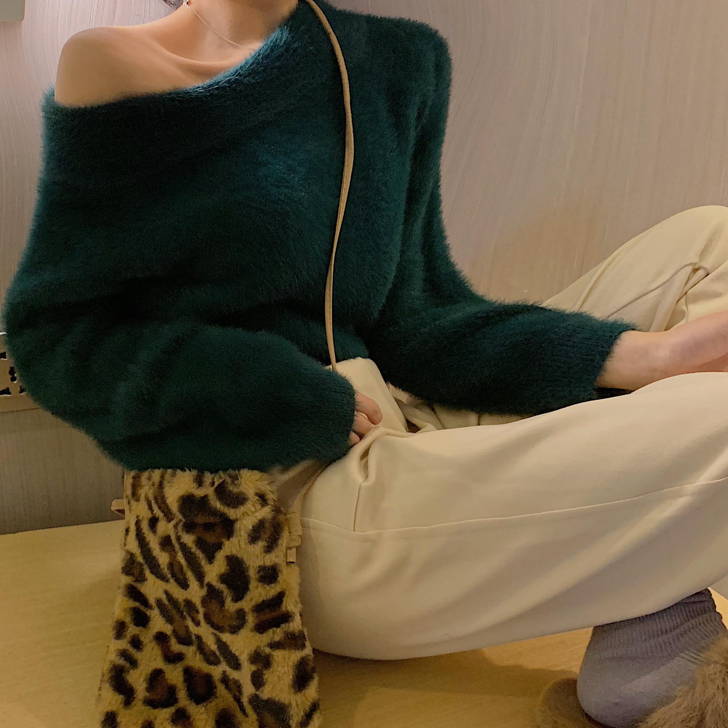 / 韓版長毛水貂絨一字領短款加厚露肩寬松毛衣