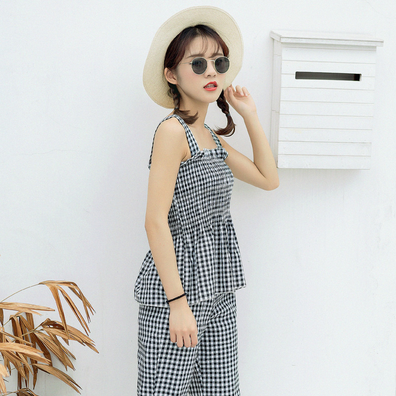/ 時尚套裝夏裝新款韓版女裝顯瘦格子吊帶高腰系帶闊腿褲兩件套