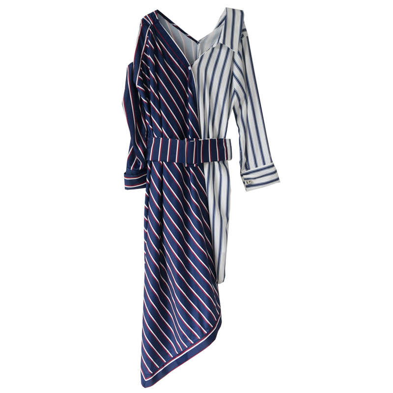 / 歐洲站街頭慵懶風2018夏新款時髦露肩條紋網紅連衣裙V領不規則裙